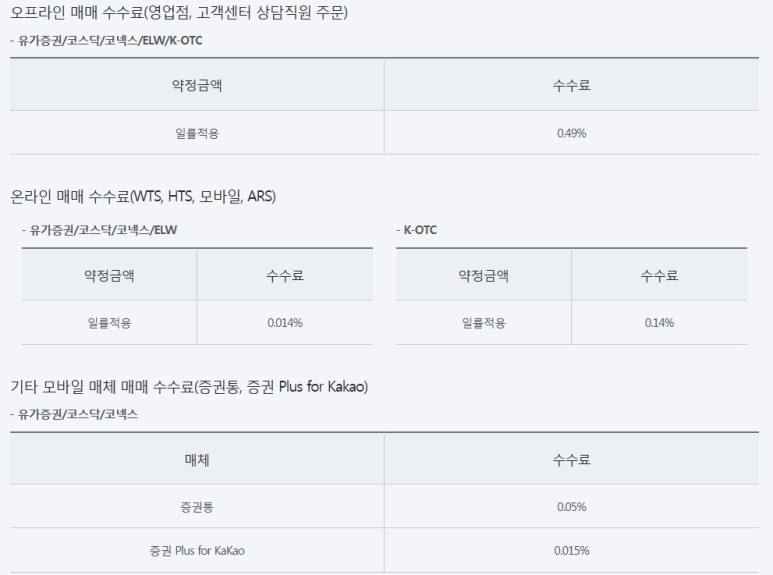주식을 매수하고 일정 기간 후 목표하는 수익을 올리게 되면 주식을 다시 매도를해야 할텐데요. 이때 수수료가 발생합니다. 그런데 각 증권사마다 수수료율이 달라서 수많은 증권사 중 적절한 곳을 잘 선택해야 할 것 같아요. 저는 미래에셋대우증권에 기존에 가입해뒀던 연금저축계좌가 있어서 일반 증권계좌도 이곳으로 선택해서 만들었는데요. 다행히 다른 증권사와 비교했을때 수수료율이 저렴한편에 속하는 증권사더라구요. 아래에 수수료율 참고하셔서 장단점 따져보시고 증권사 선택에 도움이 되셨으면 좋겠습니다.