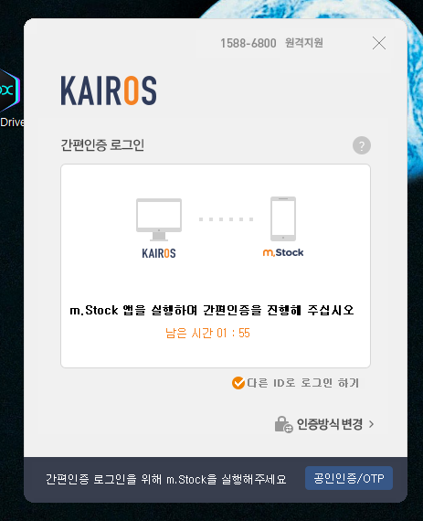 PC로 카이로스에 접속을 시도한 후 스마트폰 m.Stock 어플로 들어가시면 메인 화면에 PC접속을 시도했는지 묻는 화면이 가장 먼저 뜨구요. 확인 누르시고 본인의 로그인 방식으로 로그인 하시면 정상적으로 PC에서 로그인이 됩니다.