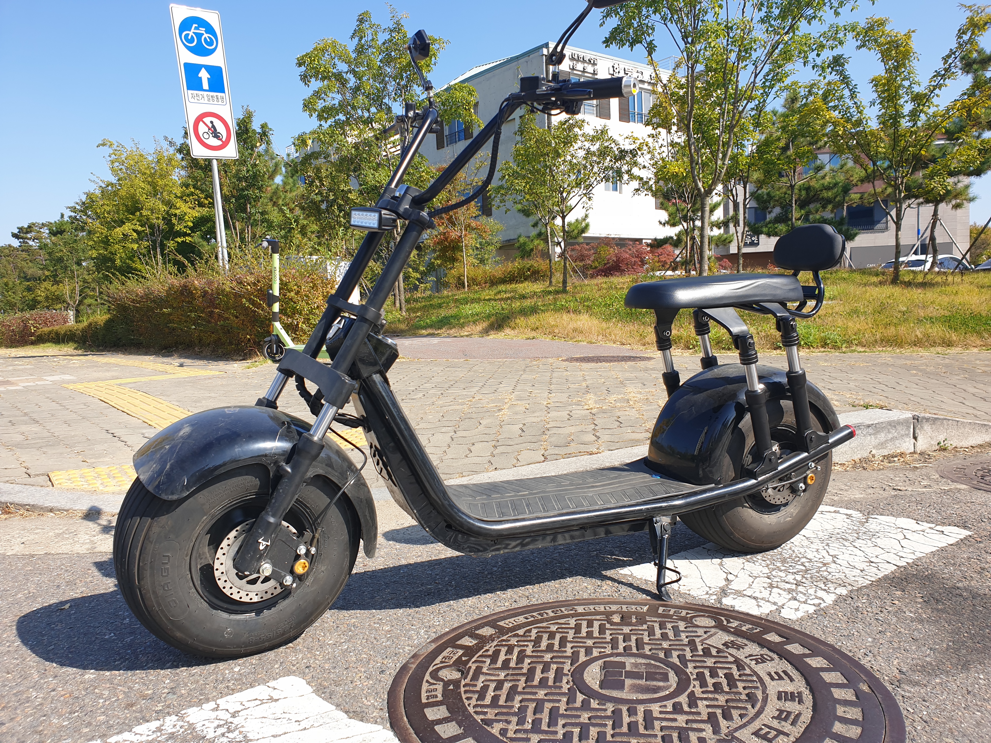 그리고 스마트키가 적용되어 있어서 이 부분도 신선했어요. 심지어 제가 타고다니는 차 조차도 스마트 키가 아닌데... ㅎㅎ 잠금 해제 키를 누르고 스마트시동 버튼을 누르면 운행이 가능한 상태가 되구요. 잠금키를 눌러놓은 상태에서 스쿠터를 살짝 만지면 엄청난 굉음이 나옵니다. 강심장이 아니라면 절때 훔쳐가지 못할 정도에요. 저도 구매전에 아무래도 도난에 대한 부분이 가장 걱정 되었는데 이렇게 경고음을 나오게 해둔 부분은 잘 만들어진 것 같아요. 사기 전에는 이거 그냥 들고가면 어쩌나 하는 걱정이 컸는데 막상 실물을 보고 나니 도난경보음도 그렇지만 너무 무거워서 절때 들고 가는 건 힘들겠구나 하는 건 금방 알 수 있겠더라구요. ㅋㅋ