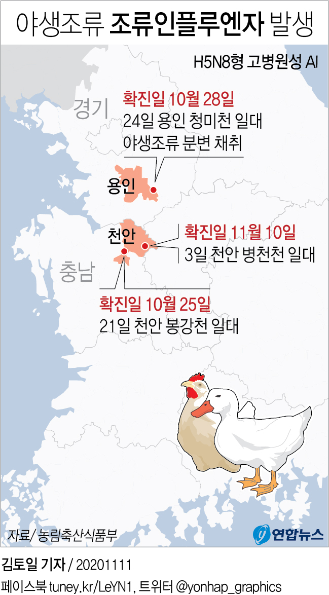 환경부와 농식품부에 따르면 이번 동절기 들어 지난달 21일에 천안 봉강천에서, 지난달 24일에는 용인 청미천에서 H5N8형 고병원성 AI 항원이 검출된 후 10일 만에 지난 3일 천안 병천천에서 같은 유형의 고병원성 AI 항원이 추가 검출됐습니다.